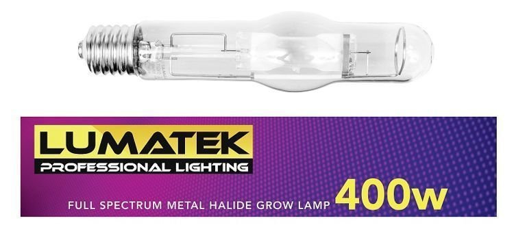 • lampa / żarówka metalohalogenkowa 400W • model: Lumatek metal halide grow lamp • pracuje na większości fabrycznych zasilaczy do HPS • gwint E40 • przeznaczona do uprawy roślin • barwa:6400K • żywotność: 10,000 godzin • wydajność: 35,000 lumenów